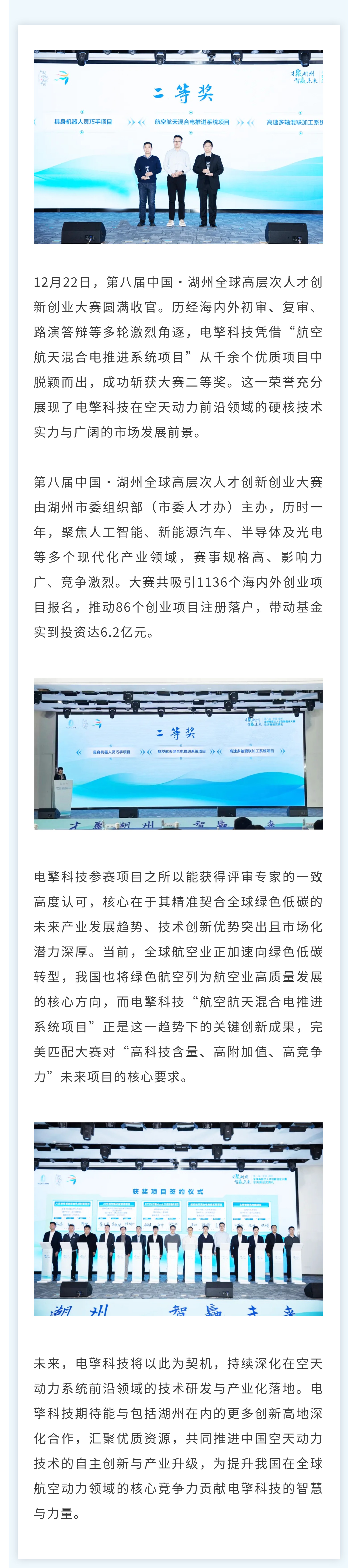 喜报!电擎科技斩获第八届湖州全球高层次人才创新创业大赛二等奖